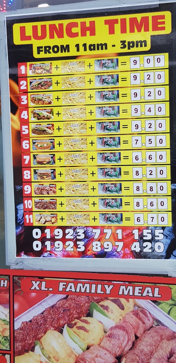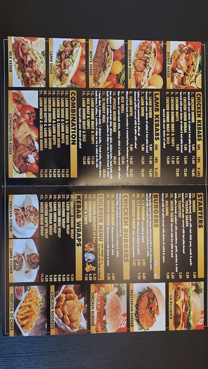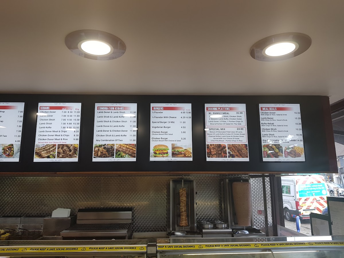 Kebab Centre offers a diverse and flavorful menu, perfect for anyone craving hearty and delicious meals. For chicken lovers, there's a variety of options such as the Chicken Doner and Chicken Shish Kebab, with prices including options like the Chicken Doner Meat & Chips or Chicken Doner Meat & Rice. If you prefer lamb, the Lamb Doner, Lamb Shish, and Lamb Kofte are standout choices, with combinations like Lamb Doner & Lamb Shish or Lamb Shish & Lamb Kofte available as well. The Mix Grill and Special Mixed Kebab are ideal for those seeking a bit of everything. For lighter bites, the 1/4 Pounder and Vegetarian Burger offer satisfying options, while the children’s menu includes Chicken Nuggets and a classic Hamburger. Wraps like the Chicken Doner Wrap and Lamb Shish Wrap are perfect for a quick meal, and the sharing platters, such as the XL Family Meal or Special Mix, are great for larger groups. The meal deals include a range of popular kebabs, from Chicken Doner to Lamb Shish. Pair your meal with drinks like Oasis or Lucozade, or treat yourself to some extras, such as Chips & Cheese or Onion Rings. If you’re looking for a light bite, options like Humus, Tzatziki, and Mixed Salad complement any dish beautifully. Whether you're dropping by for a quick lunch or a family feast, Kebab Centre caters to all tastes with its broad menu.